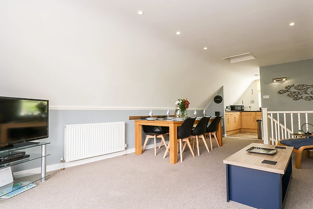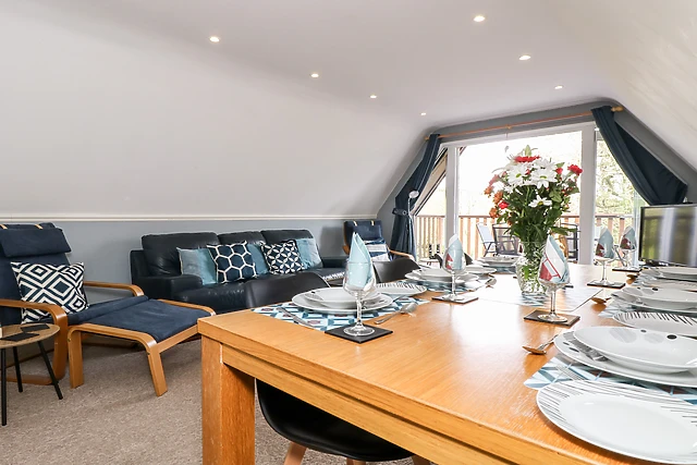 The lodge boasts an inviting open-plan living space that leads out to a balcony, where you can bask in the surrounding natural beauty. The accommodation is thoughtfully equipped with modern conveniences, including a dishwasher and broadband/WiFi, ensuring a seamless stay.