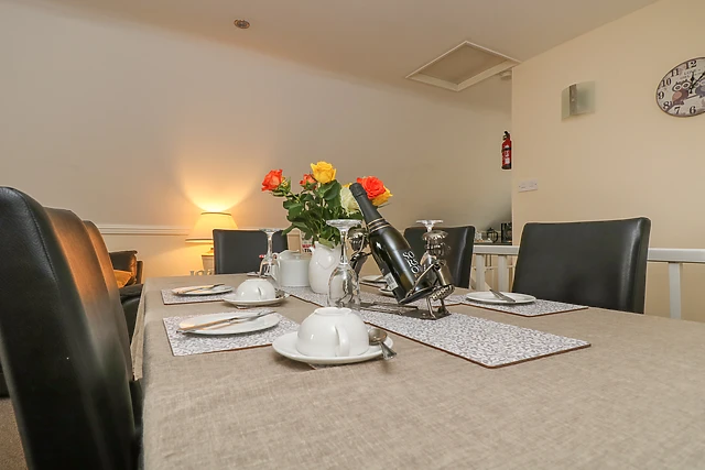 As you take the stairs to the first floor, you will come across a welcoming open-plan living room with TV, DVD, and Bluetooth Sound bar. A large Dinning Table seating up to 8 people entices you to sit for long meals catching up with friends and family.