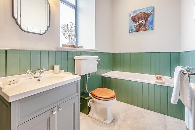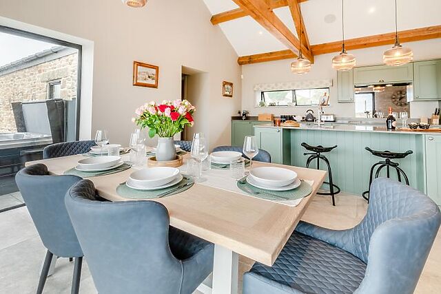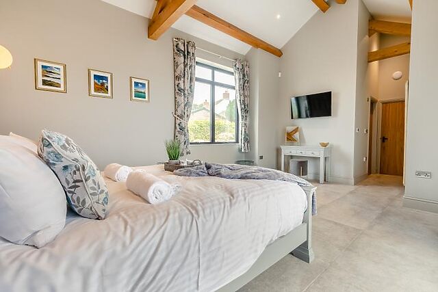 The ground floor features a twin bedroom and a double bedroom, both with Smart TVs and en-suite shower rooms. The open-plan kitchen/diner is the heart of the home, boasting vaulted ceilings and bi-fold doors that open onto the garden, offering stunning countryside views.