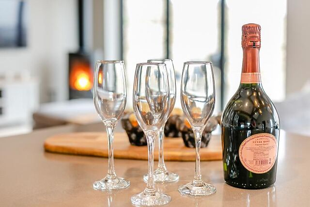 The cosy lounge area is perfect for relaxing with two sumptuous sofas, a wood burner, and a Smart TV.