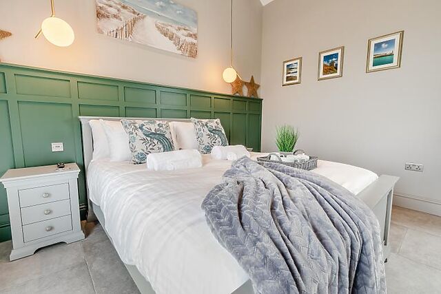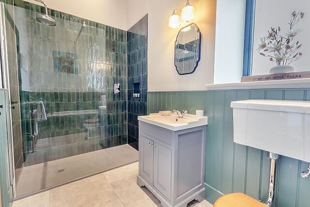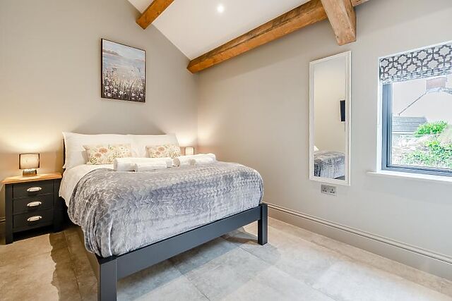 The king-size suite on the lower level has vaulted ceilings, bi-fold doors to the garden terrace, and a luxurious en-suite bathroom. The garden is a private paradise with a Cornish stone wall, sunken seating area, patio terrace, and a hot tub under the star-lit sky.