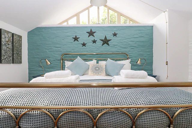 The master bedroom has a strong romantic presence with a super king size bed dressed with crisp cotton bed linens, set beneath a dramatic gable window which allows natural light to flood in. For flexibility, a second spacious bedroom is furnished with a zip and link bed, which can be presented as a twin beds or a super king size bed on request.