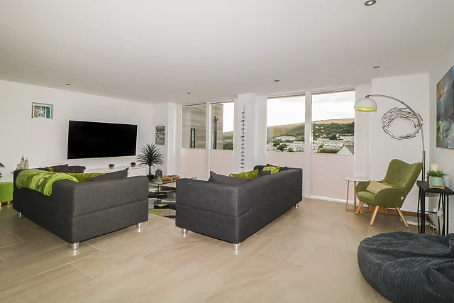Completing the ground floor is a contemporary shower room, where you can get ready in style, whilst the living area rests upstairs, offering a social hub to prepare meals, dine, and plan your break. The kitchen area is well-equipped, where you can rustle up home-cooked recipes to be enjoyed around the lofty dining table, or head outside, selecting from three outdoor spaces to dine.