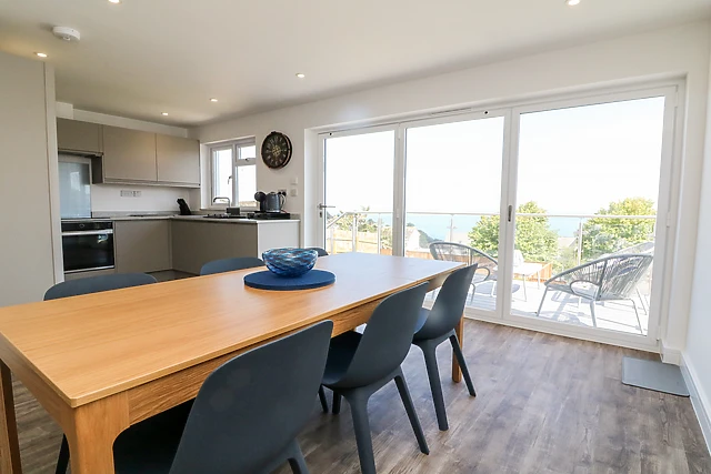 The rear decked terrace offers elevated views of the nearby shores, providing an idyllic backdrop for relaxation.