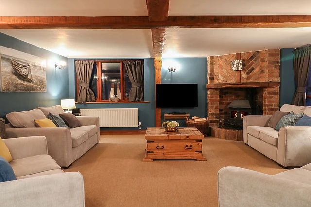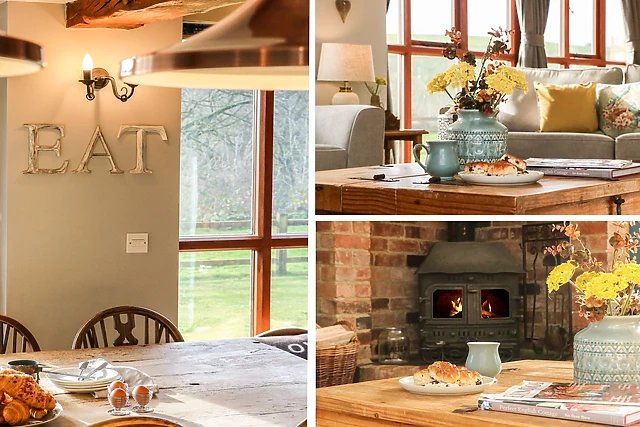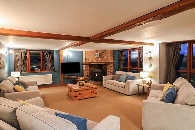 The open-plan living area, adorned with a woodburning stove, provides a cosy and inviting atmosphere for guests to gather and unwind.