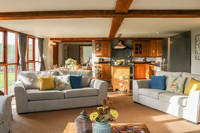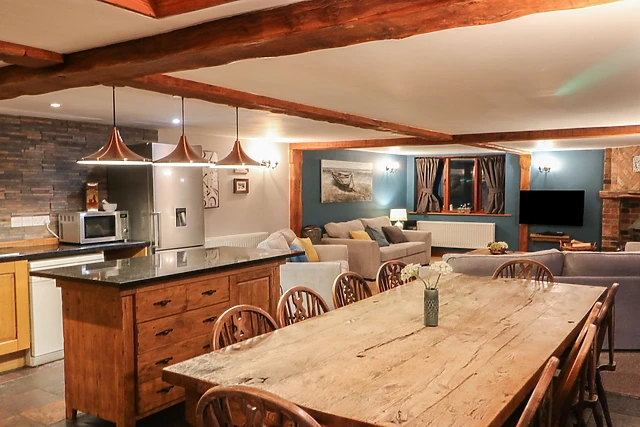 The property boasts four modern bathrooms, with three en-suite facilities complementing the king-size bedrooms, and a ground-floor bedroom designed for accessibility. The open-plan living area, adorned with a woodburning stove, provides a cosy and inviting atmosphere for guests to gather and unwind.