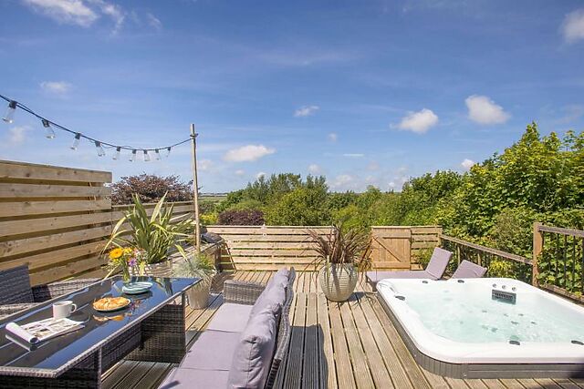 Yes, the property features a private, sunken hot tub on the decked patio area, allowing guests to relax and enjoy the panoramic countryside views in a warm and soothing setting.