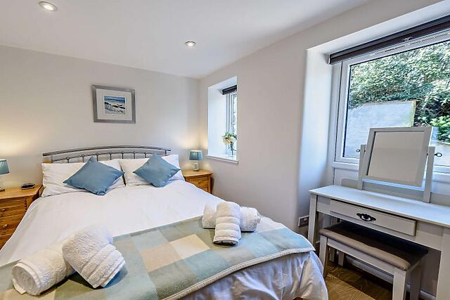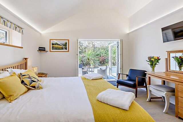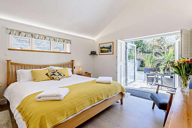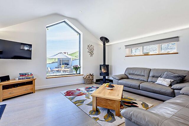 You will also find an attractive first-floor lounge with Smart TV/DVD, wood burner and full-height feature window. There are three tastefully decorated and peaceful bedrooms: the master super-king-size room opens onto a charming terrace and is next to a handy wet room; two further bedrooms are on the lower ground floor: a cosy double and a king-size zip-and-link.