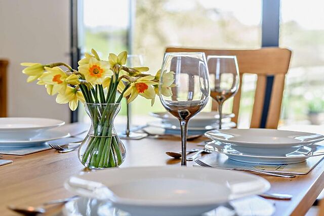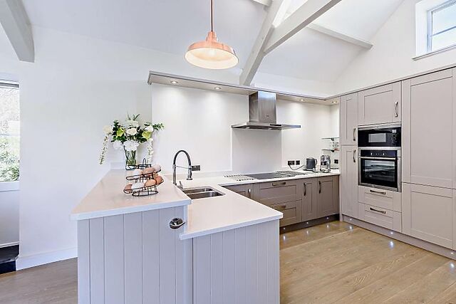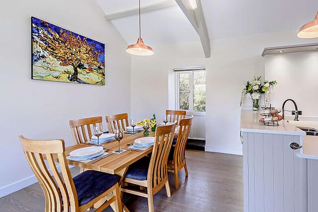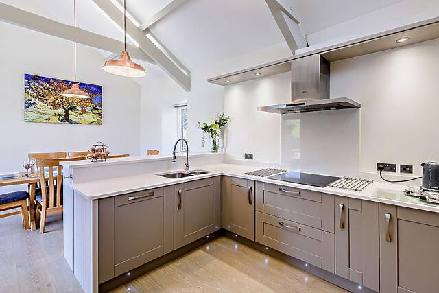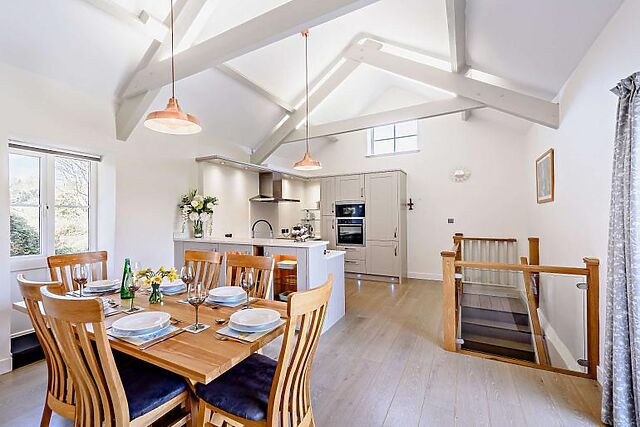 Beautifully decorated in bright, natural tones, this fantastic light-filled stone barn has been imaginatively updated and features vaulted, beamed ceilings, a cheerful wood burner and full-height feature windows as well as access to 12 acres of meadowland. Entering the property via the patio door, you will find the spacious and relaxing kitchen/diner, which is a perfect space to enjoy a family meal.