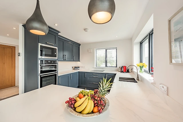 The open-plan living space is bright and airy, courtesy of the floor to ceiling windows that provide an outlook to the beach and sea. Take a seat on the L-shaped sofa and flick on the TV for entertainment, whilst the chef of the group takes over the kitchen and prepares a hearty dish, finished with sleek units and integrated appliances.