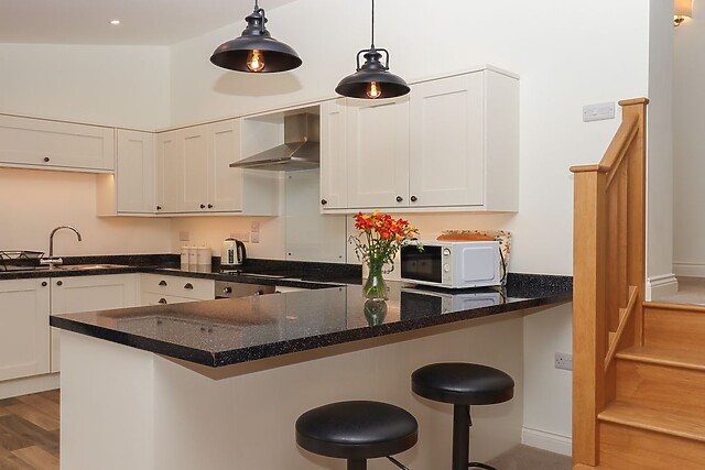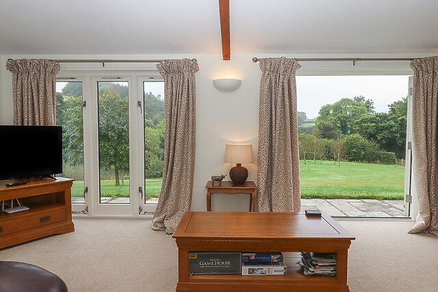 Wooden steps lead to the two well-accompanied bedrooms, a king-size and a twin, which can be converted into a super-king-size on request, offering flexible sleeping arrangements to suit your group. Both rooms are tastefully decorated, ensuring a rejuvenating night's sleep after a day of exploring the Devonshire countryside.