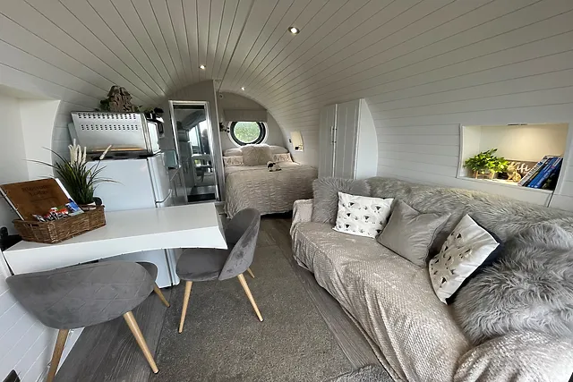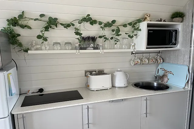 The accommodation includes a well-appointed kitchen with a two-ring electric hob, combination microwave oven, and fridge freezer, allowing guests to prepare meals with ease during their stay.