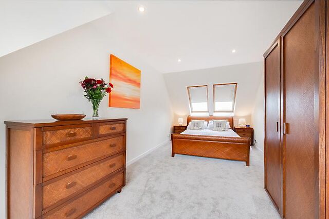 Inside, you'll find a large living room that flows into a light-filled conservatory, offering ample space to unwind. The sleek black and white kitchen is fully equipped with modern appliances, including a coffee machine and wine cooler.