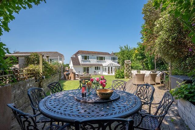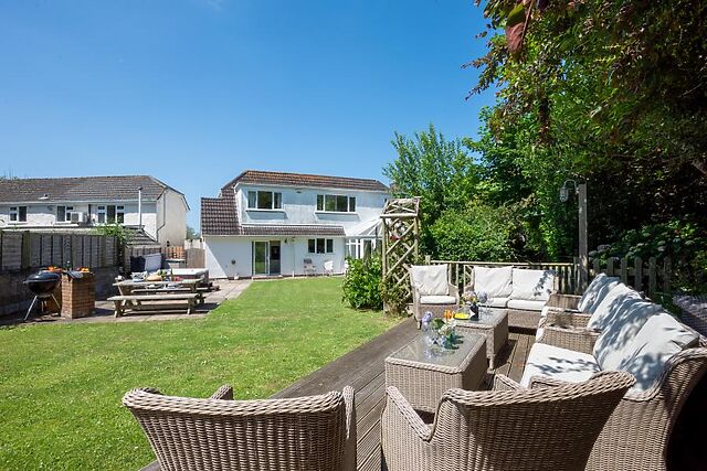 Host a special seaside getaway with a group of friends or family at this spacious and elegant five-bed property where you can host a garden party and sink into the hot tub after a day on the nearby sandy beaches and national trust areas with dramatic cliff-top walks and nesting seabirds. Step inside and find yourself in the bright and airy living room with warm tones and comfortable seating in front of the TV with an Amazon Fire Stick and a door which leads out to a conservatory.
