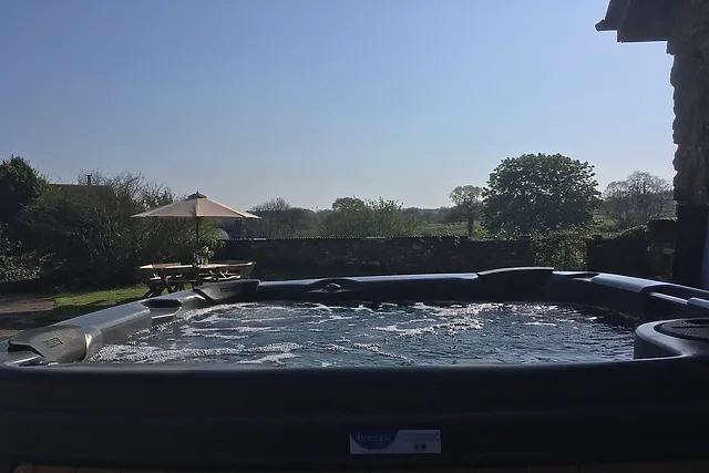 Yes, this accommodation boasts a private hot tub that comfortably seats five people. It's the perfect place to relax and enjoy the surrounding countryside views after a day of exploring the local area.