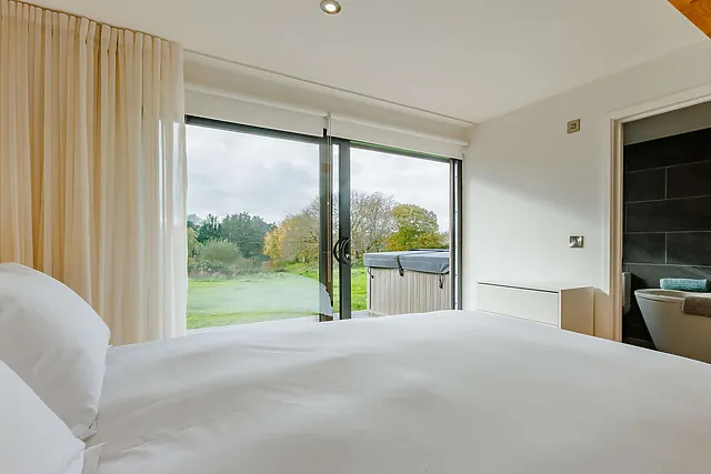Yes, the accommodation features a private hot tub, allowing guests to relax and enjoy the picturesque views of the surrounding countryside in a tranquil setting.