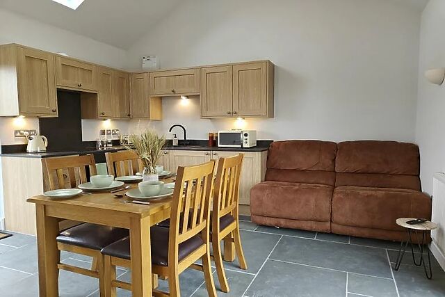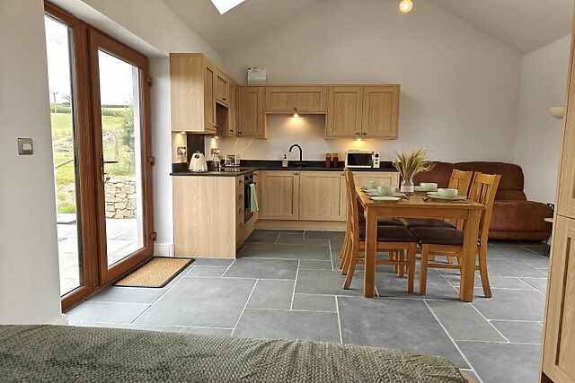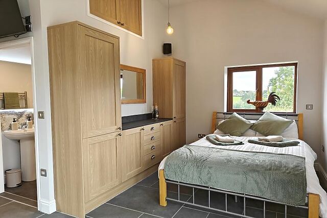 Located on a private lane and amid green pastures close to the River Mole, this farm building makes a perfect couples' bolthole. A studio-style, open-plan layout prioritises together-time as you cook, dine and stretch out on the sofa before the Smart TV; the space is uncluttered, contemporary and well-lit by fully glazed dual-aspect doors that give lovely views over the surrounding landscape.