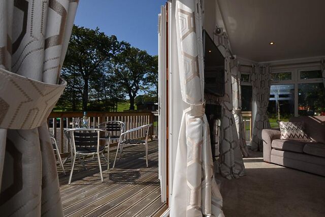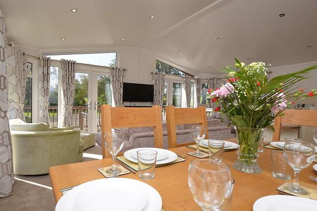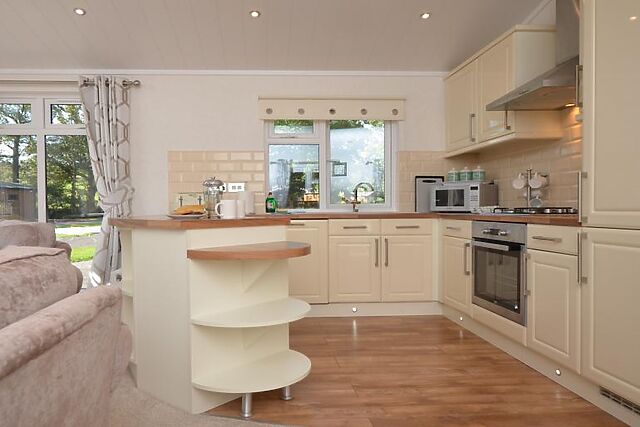 This is a log cabin/lodge type of property. It offers a comfortable and stylish stay with modern amenities and a beautiful open-plan living area, perfect for a relaxing break.