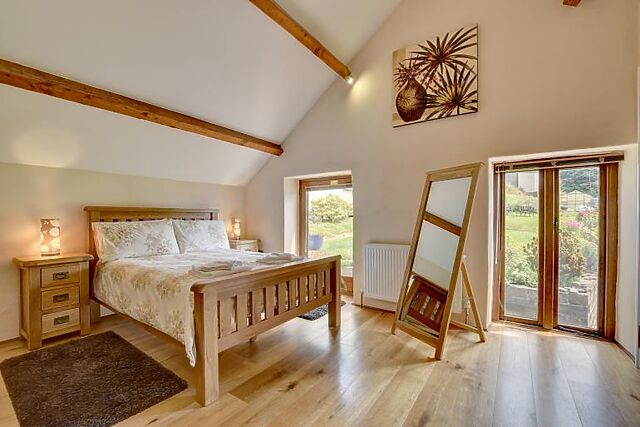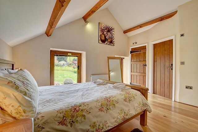 The cottage features a delightful open-plan living area with a double-height lounge, Shaker-style kitchen, and spacious dining area. Original beams and barn-style timber doors add character to the space, while underfloor heating ensures a warm and inviting atmosphere.