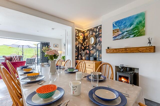 Light the wood burner in the dining area, so you can sit down to hearty meals in its cosy ambience and find everything you need in the sizeable kitchen space to help you produce delicious feasts. Then unwind together in the lounge: light the wood burner, recline on the large L-shaped sofa, and simply relax in front of the Smart TV.
