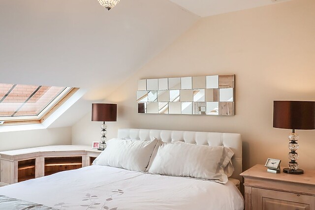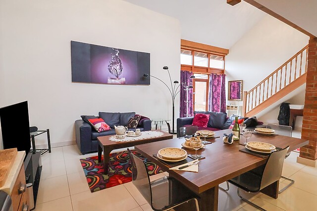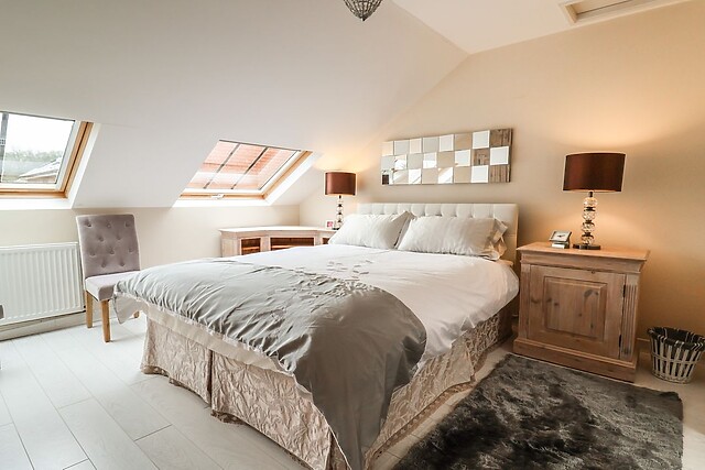 The open-plan living area is an impressive double height room with vaulted ceiling, underfloor heating and characterful ceiling beams throughout. The sleek and stylish kitchen is well equipped so you can cook meals with ease before retreating to the restful seating area in front of the Smart TV.