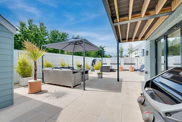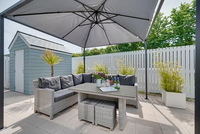 The garden also includes a gas BBQ, outdoor shower, and comfortable seating areas for dining or simply relaxing. The property is dog-friendly, allowing up to two dogs, and provides dog bowls and treats.