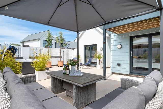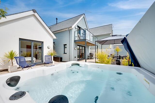Step outside to a private patio featuring a hot tub that accommodates five people, perfect for unwinding after a day of exploring. The garden also includes a gas BBQ, outdoor shower, and comfortable seating areas for dining or simply relaxing. The property is dog-friendly, allowing up to two dogs, and provides dog bowls and treats.