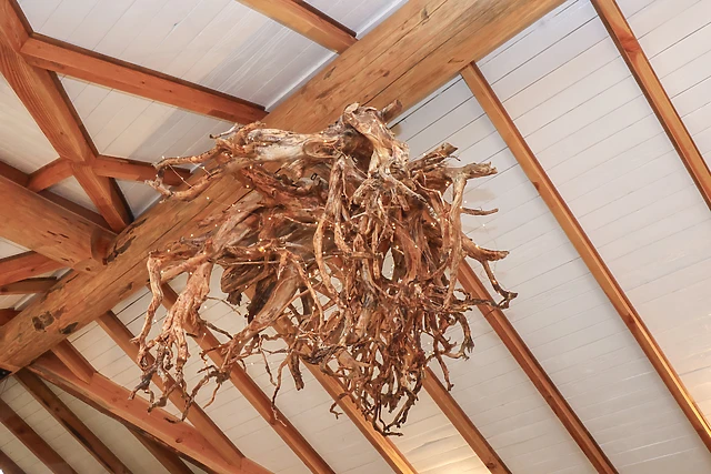 The main quarters feature a distinctive and inviting aesthetic, highlighted by a tree root transformed into a unique light fixture. This rustic element adds character to the open-plan living space and supports the overall structure of the lodge, enhancing its natural appeal.