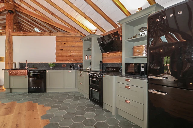 After a day of exploration, unwind in the luxurious super-king-size bedroom with a relaxing bath, followed by a restful night’s sleep on a plush bed. Ideal for hosting special occasions, the lodge offers a spacious, open-plan area where you can cook delicious meals in the fully equipped kitchen, dine at the oak dining table, and enjoy cozy evenings by the woodburning stove as the sun sets.