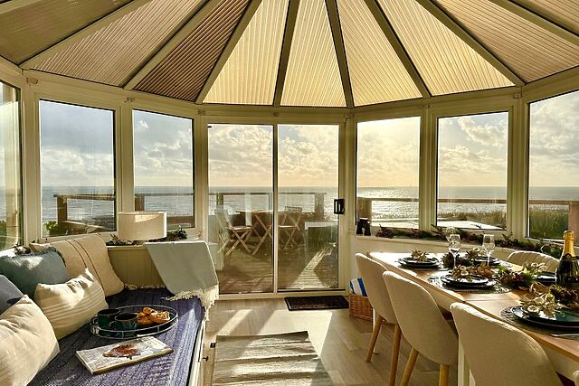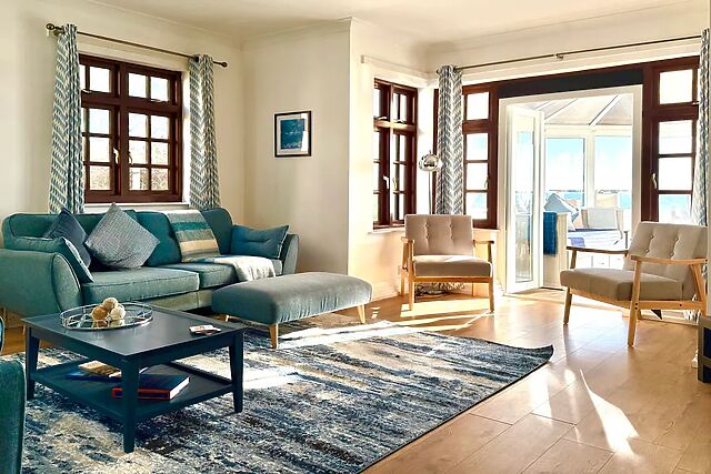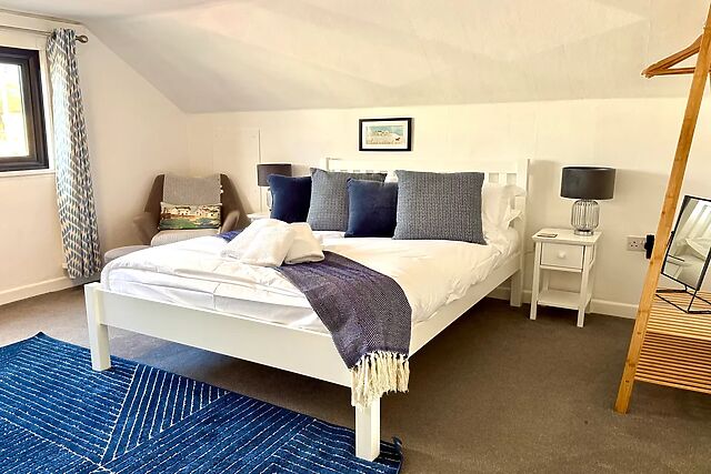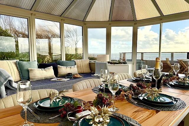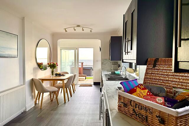 As you enter Crows Nest, the ground floor flows from the hallway to a large bright living room, featuring a 50-inch tv and coastal style decor, through into a light-filled conservatory featuring a daybed and large dining table capable of seating up to 10 guests comfortably. Both spaces are positioned to make the most of its coastal outlook and patio doors in the conservatory provide access out into the garden, really bringing the outside in.