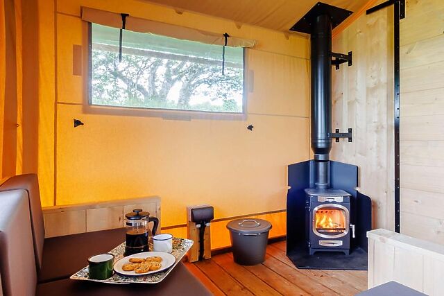 Couples looking for a romantic getaway will find this safari tent an idyllic retreat. The peaceful farm setting and the warmth of the log burner create a cosy atmosphere. Nearby, romantic days out await in the coastal towns of Dartmouth and Brixham, with their charming harbours and intimate dining spots.