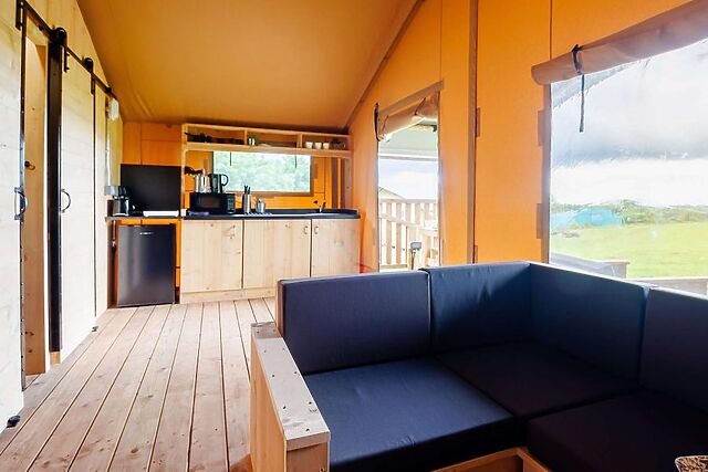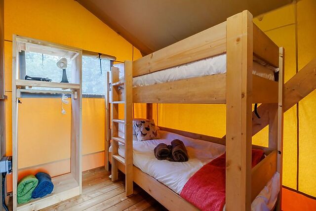 The tent boasts two cosy bedrooms, one with a double bed and another with bunk beds, ensuring a restful night's sleep.
