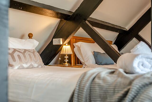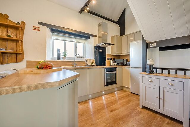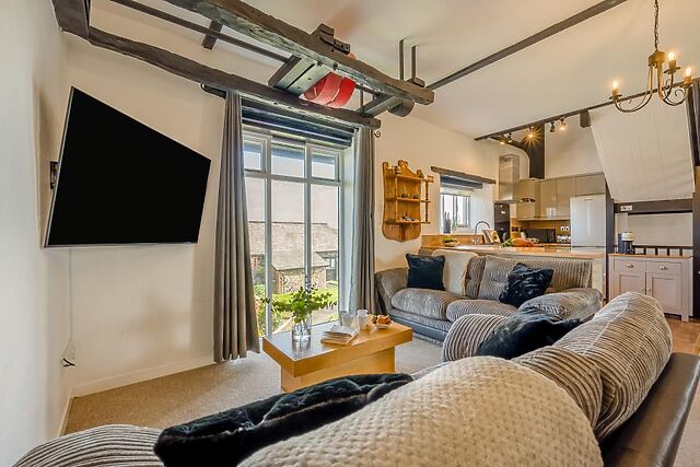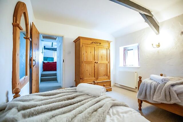 Head inside and find that the rural charm continues in the form of exposed wooden beams and sturdy oak furniture. At the ground-floor level, you’re greeted by the first of three generous bedrooms that allow for flexible sleeping options, a restful family room with a king-size bed and an additional single, served by an en-suite shower room.