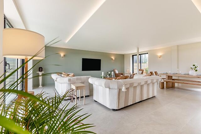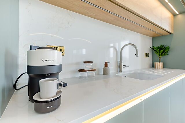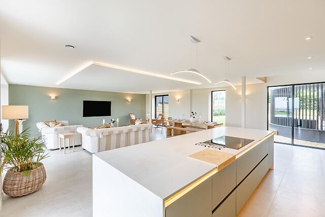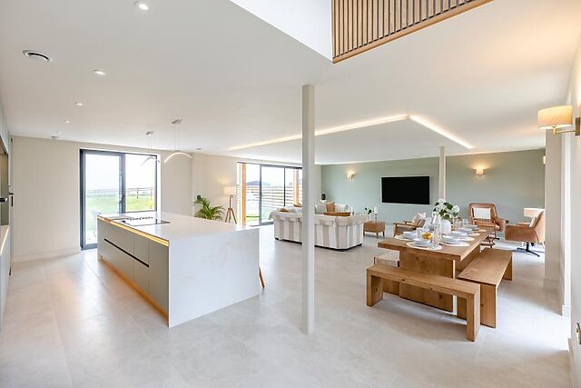 A large wall mounted Smart TV, sofas and a large dining table where you can enjoy memorable mealtimes complete the area. The kitchen itself is thoughtfully designed and well fitted with everything you need to cater for your group.