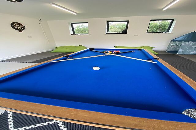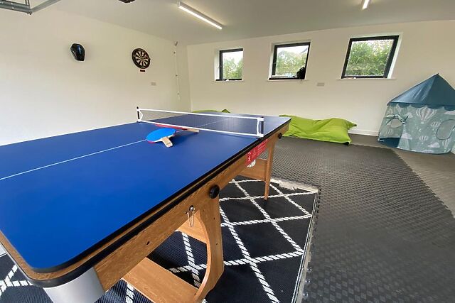 Heading up the stairs to the first floor, you have five bedrooms – the glass bridge connects two ends of the building, the master suite at one end has a super-king bed and slipper bath, fabulous views and Juliette balcony, as well as a built-in wardrobe and en-suite shower room with WC. Next to this is a playroom for little ones, or gaming room and Smart TV for the kids, with a collection of games, books and puzzles.