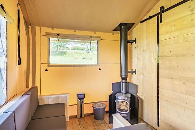 The tent boasts a wood-fired hot tub, where you can relax and soak up the peaceful atmosphere, and a fire pit for memorable evenings under the stars.