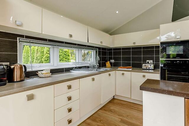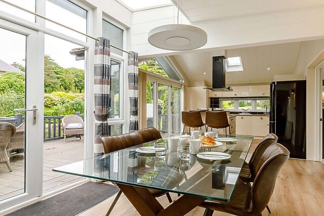 The lodge is family-friendly, offering a travel cot and highchair for little ones, and is situated in a peaceful location suitable for family relaxation.