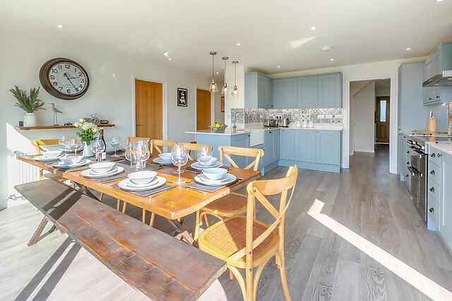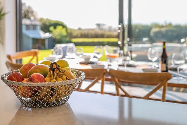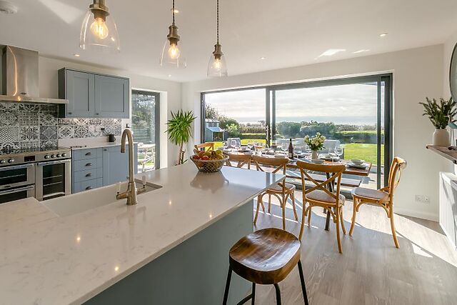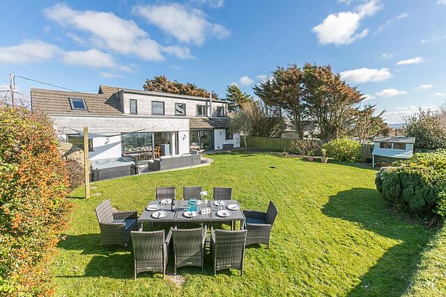 Both are flooded with light from full-length glass doors opening onto an expansive patio with outdoor furniture and a BBQ. The lovely garden has a large lawn, with masses of space for children and pets to play, along with the hot tub and outdoor shower for sandy feet.