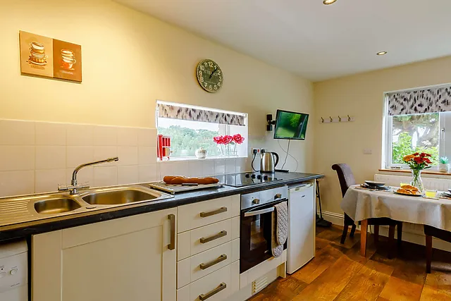 The cottage offers a delightful open-plan living space, complete with a well-equipped kitchen and a comfortable lounge area, perfect for unwinding after a day of exploration.