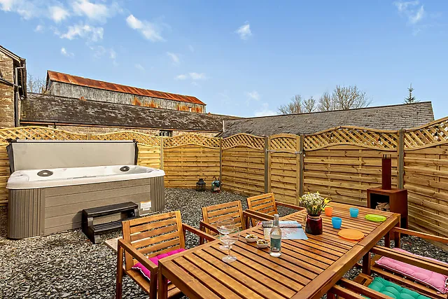 Yes, the accommodation features a private hot tub in an enclosed courtyard, providing guests with the perfect spot to relax and unwind during their stay.
