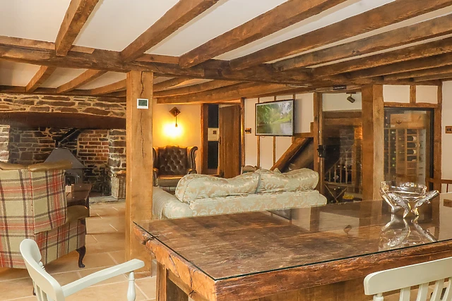 Adjacent to this, the dining area houses a rustic handmade wooden table and benches seating for eight, perfect for hosting memorable meals. After dinner, retire to the sitting room, where a Smart TV and a woodburning stove await to offer a warm end to your day.