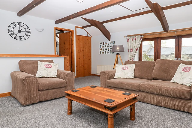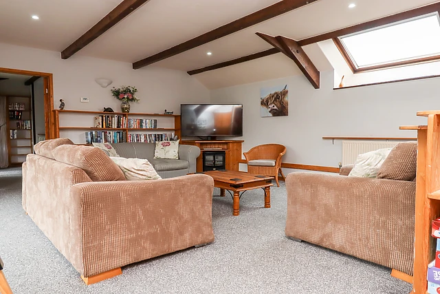 Enjoy a meal around the dining table before heading upstairs and making yourself at home in the living space, equipped with comfortable seating, a Smart TV and an electric fire, inviting you to spend your down time. At either end of the room lies the bedrooms; the master offers a king-size bed, TV with Roku stick and DVD player, walk-in wardrobe and en-suite bathroom, whilst the family room hosts a double and single bed with an en-suite shower, WC and basin and smart TV.