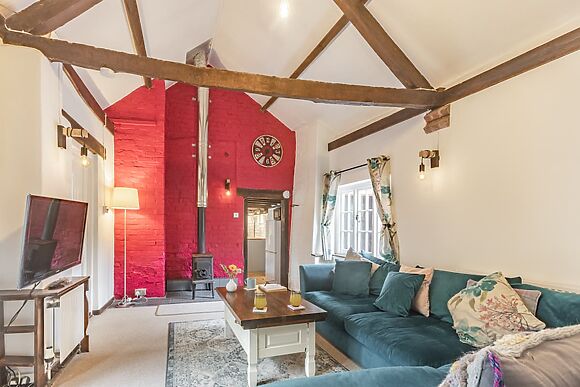 The living room woodburner with plush L-shaped sofa makes for a cosy evening. Full Sky TV package including sports movies and kids' channels adds to the comfort.