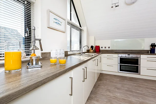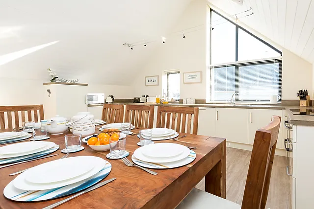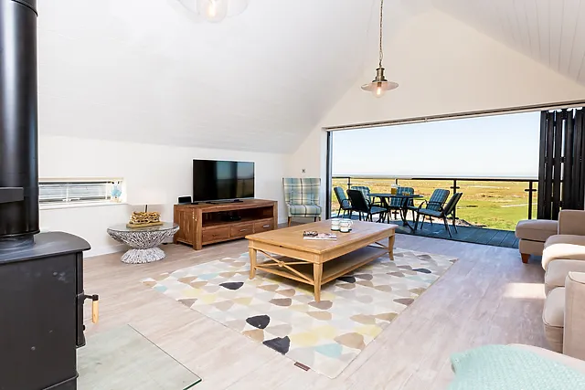 The heart of the home is the elegant open-plan lounge/kitchen/diner on the first floor, complete with a traditional woodburner and a balcony offering sweeping sea views. The kitchen is fully equipped to cater to all your culinary needs, ensuring a seamless self-catering stay.