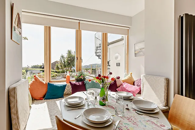 Guests can enjoy the property's rear enclosed paved garden, which includes dining areas and stunning waterside views for alfresco dining and relaxation.