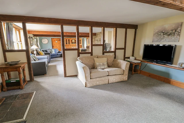 Immerse yourself in the rustic elegance of the barn, with its exposed beams and stone fireplaces, creating a cosy atmosphere for relaxation. The spacious farmhouse kitchen, complete with a large refectory dining table, invites you to create and enjoy memorable meals together.