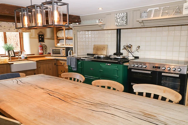 The spacious farmhouse kitchen, complete with a large refectory dining table, invites you to create and enjoy memorable meals together.