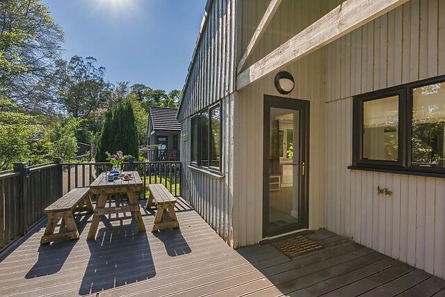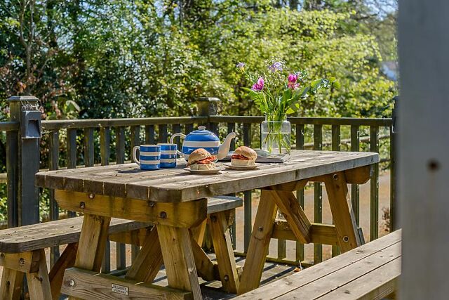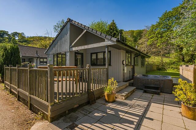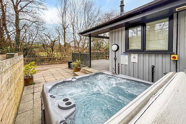 From the decked area, a few steps lead down to the private hot tub with views over towards the woodlands. Private parking is available for one car, with additional space nearby.