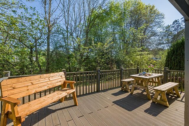 With a lovely soothing hot tub and a charming decked space, this airy lodge is great for walkers, beach lovers and nature spotters discovering the area’s picturesque villages, historic sites and wonderful sandy beaches. Two steps lead up onto the decked area and into this welcoming single-level cabin.