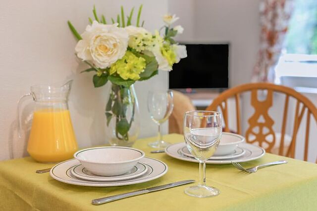 The kitchen is well-appointed with everything needed to rustle up tasty meals during your stay. Adjacent to the kitchen, the dining area offers a comfortable spot to gather and enjoy meals or plan the day’s adventures.